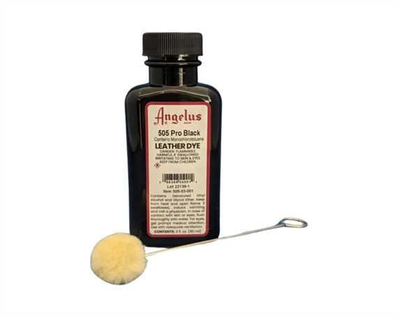 Angelus Pro Series 505 Leather Dye is a permanent liquid dye used for changing the color of all smooth leather items. This dye is guaranteed to penetrate leather and form a lasting color which will not peel, crack, or wash off. Excellent for use in manufacturing or re-coloring saddles, tack, shoes, belts, purses, knife sheathes, etc. Each bottle of dye comes with one wool dauber and the box can be converted into a holder for the bottle while you work. Note: This is for professional use only with heavier pigments that allow the dye to penetrate hard and/or difficult leathers.