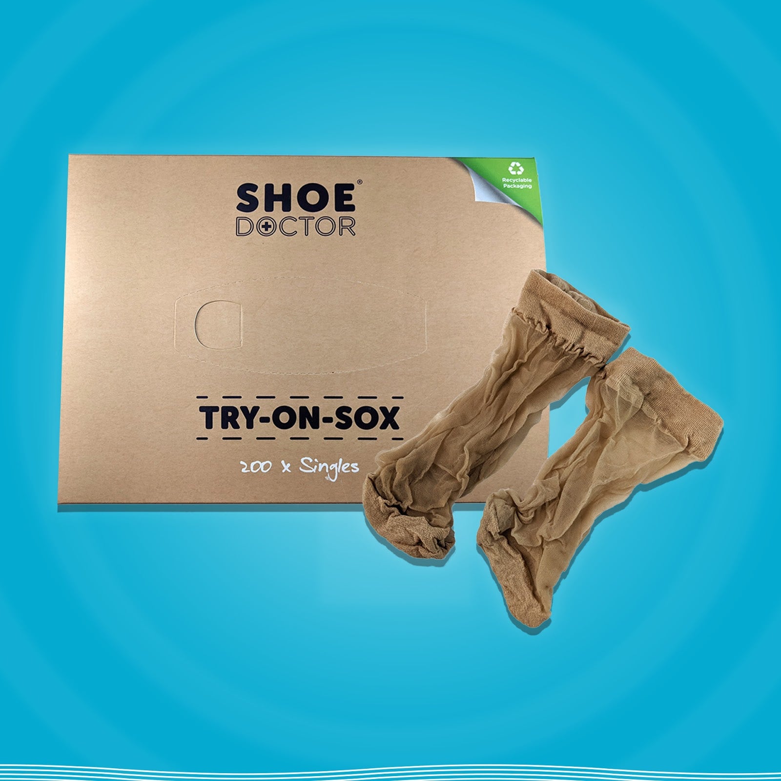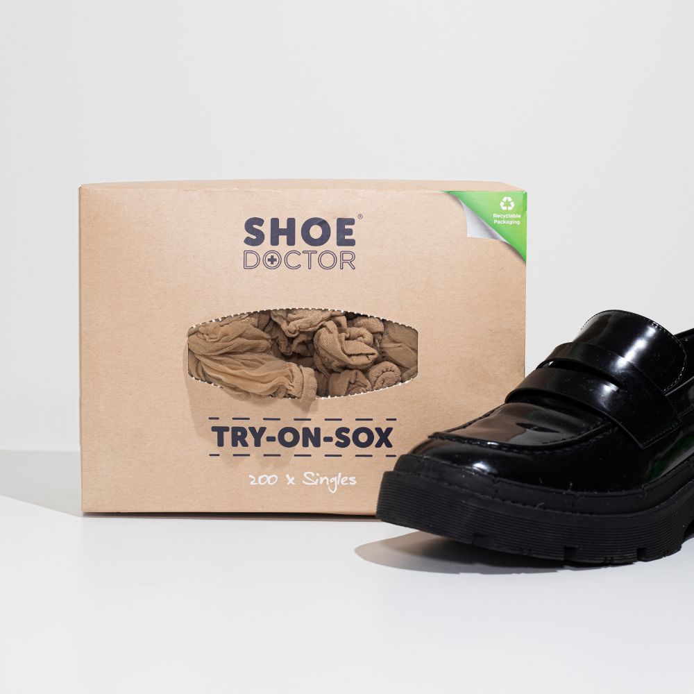 Select your own brand new sock from a tissue type box when trying on shoes in store. One size fits all – making them a great selling aid. One time Use!