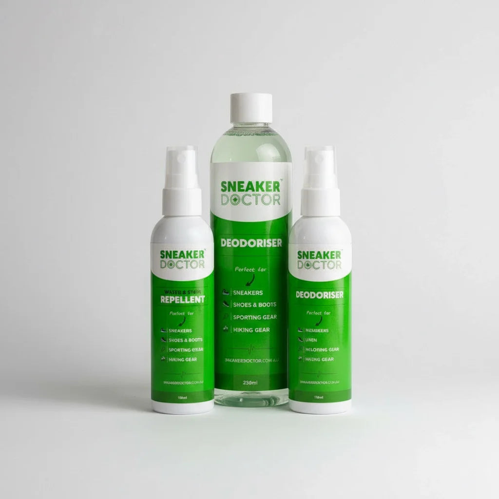 Keep your sneakers clean and fresh with the Sneaker Doctor Bundle. The bundle includes the Sneaker Doctor Water & Stain Repellent, providing an invisible protective coating that repels water and stains, perfect for delicate shoes and clothing. The Sneaker Doctor Deodoriser eliminates tough odours on shoes, clothing, and more, ensuring that odour-causing agents are completely eradicated. Lastly, the Sneaker Doctor Stain-X cleaner, safe for all materials, effectively removes dirt and grime while being gentle on suede, nubuck, and fabric. Say goodbye to dirty and smelly sneakers with this essential bundle.
